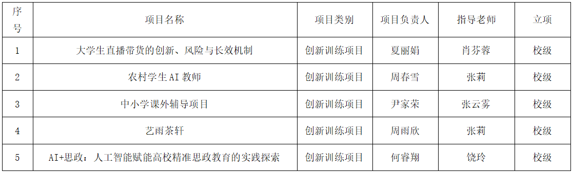 根据学校《关于我校第十八批“大学生创新创业训练计划”项目申报的通知》,以及伟德国际victor·1946源自《2025年伟德国际victor·1946源自“大学生创新创业训练计划”项目申报答辩通知》相关安排,通过学生项目申报汇报答辩,专家评审,拟推荐肖芬蓉老师指导的《大学生直播带货的创新、风险与长效机制》等5个项目作为校级大学生创新创业项目,具体名单见附件。