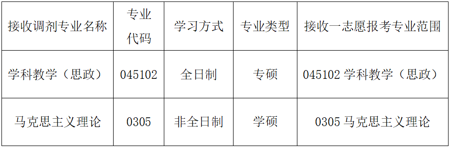 根据教育部发布的《2026年全国硕士研究生招生考试考生进入复试的初试成绩基本要求》和第一志愿考生复试结果进行测算,我院科教学(思政)专业(全日制)、马克思主义理论专业(非全日制)尚有部分调剂名额,拟接收调剂生源,欢迎广大考生报名申请调剂至我校学习深造。现将有关事项公告如下: