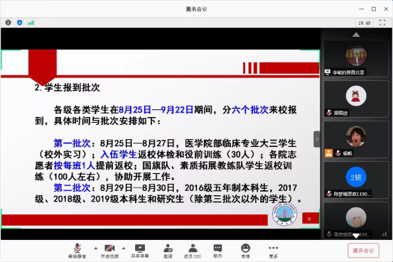 8月22日-8月23日,辅导员李敏老师分两场组织了本次主题班会,2019级本科生及2018级、2019级研究生参与其中。李老师重点强调了学生开学前的准备工作和返校后的注意事项,提醒大家高度重视疫情防控,充分准备个人防护用品、遇到困难问题及时沟通等。