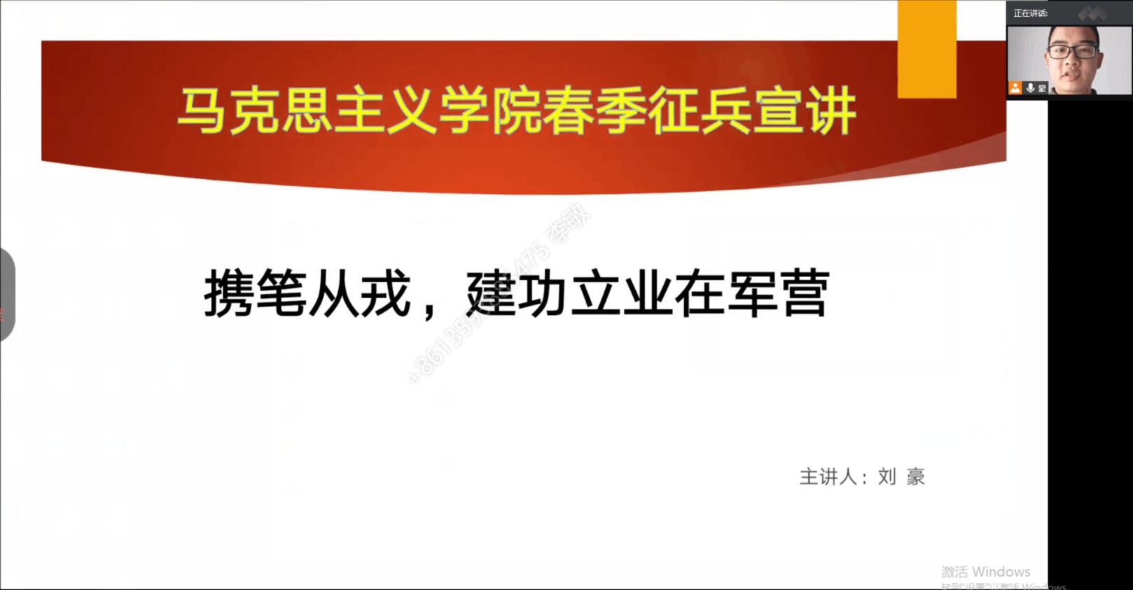 (通讯员 刘豪)6月6日下午17:00,伟德国际victor·1946源自通过腾讯会议开展2020年春季征兵宣讲会。学院兼职辅导员、退役士兵刘豪主讲,学院全体男生和部分女生参加了宣讲。