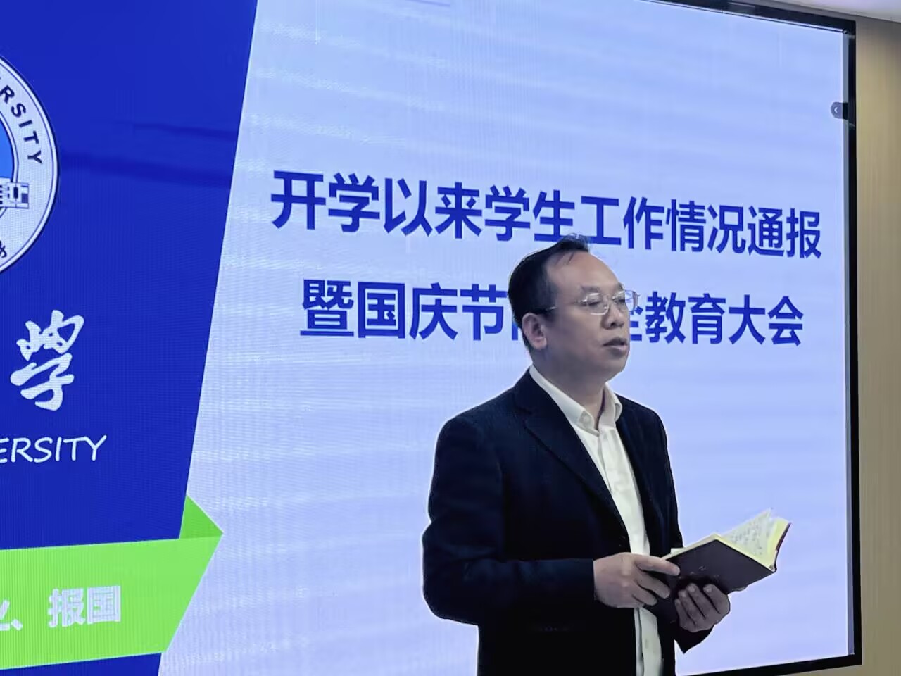 会上,张云雾通报了开学以来迎新、军训、日常管理、资助、就业、心理健康、团学工作等学生工作进展情况,开展了国庆节前安全教育,并就《伟德国际victor·1946源自普通本科生奖助学金管理办法》进行了解读,部署了2024-2025学年学生工作先进集体和先进个人评选工作。随后,邓鹏老师重点就研究生国庆假期安全稳定工作进行了强调,要求全体学生干部切实履行提醒与监督职责,全力保障广大同学平安度过假期。